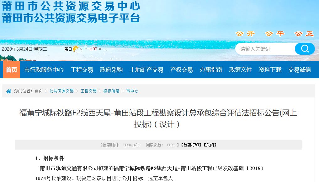 福莆宁城际铁路F2线西天尾-莆田站段工程已经发改基础〔2019〕1074号批准建设。