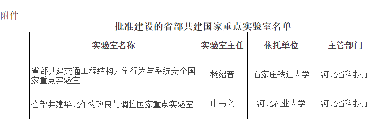 为提高区域自主创新能力,推进区域科技创新体系建设,加大创新驱动区域经济社会发展力度,落实科技部与河北省部省会商会议相关议定事项,经河北省人民政府推荐和专家论证,省部共建交通工程结构力学行为与系统安全、华北作物改良与调控国家重点实验室已基本具备建设运行条件。现决定批准省部共建交通工程结构力学行为与系统安全国家重点实验室和省部共建华北作物改良与调控国家重点实验室(以下简称实验室)建设运行。