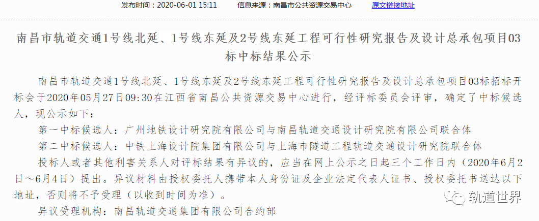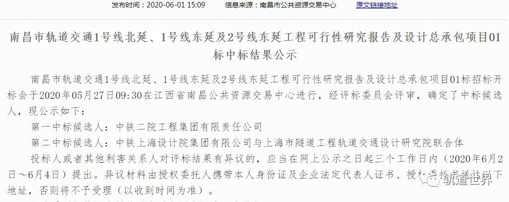 南昌地铁1号线北延东延 2号线东延可研及设计总承包中标结果