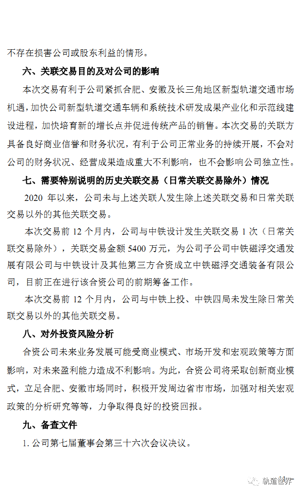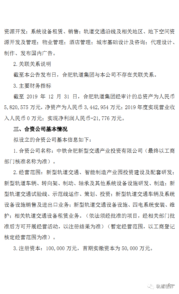 合资公司拟开展新型轨道车辆、转向架、制动、轴承及其他系统设备设施研发、制造;新型轨道交通试验线、示范线运作、策划、投资;新型轨道交通车辆及系统设备设施销售及进出口业务;新型轨道交通设备设施、四电系统安装、维护;相关轨道交通设备租赁业务。