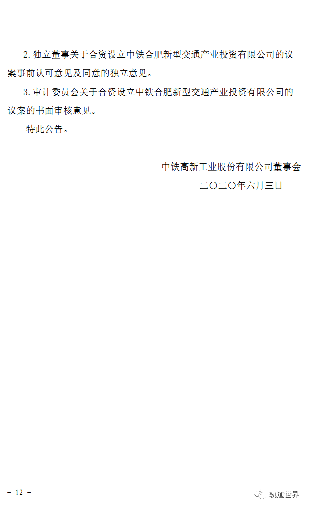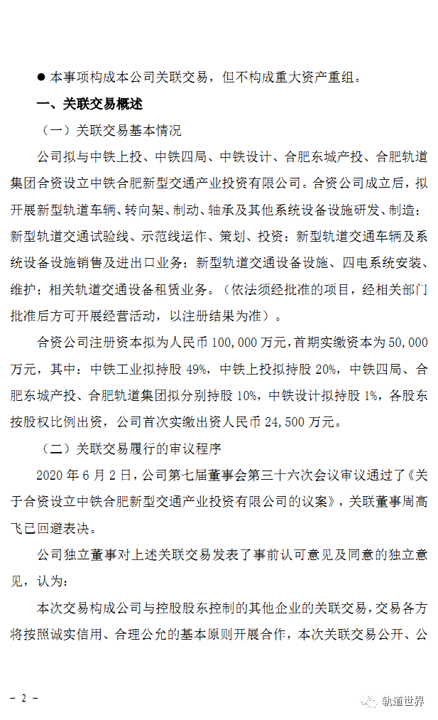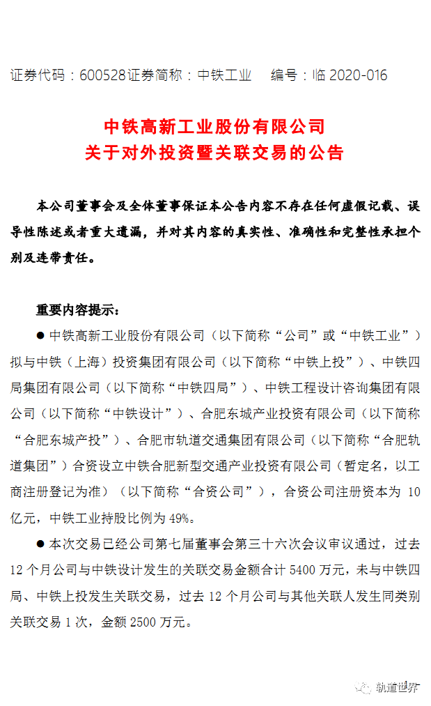 中铁工业(600528)6月3日公告称,拟与中铁上投、中铁四局、中铁设计、合肥东城产投、合肥轨道集团合资设立中铁合肥新型交通产业投资有限公司。合资目的:紧抓合肥、安徽及长三角地区新型轨道交通市场机遇,加快公司新型轨道交通车辆和系统技术研发成果产业化和示范线建设进程,加快培育新的增长点并促进传统产品的销售。