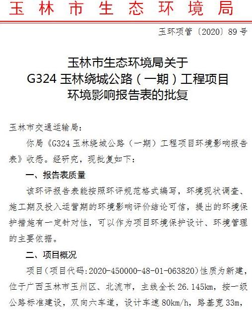 2020年12月29日,玉林市生态环境局批复称,同意按照环评报告表中所列建设项目的地点、性质、规模建设G324玉林绕城公路(一期)工程项目。
