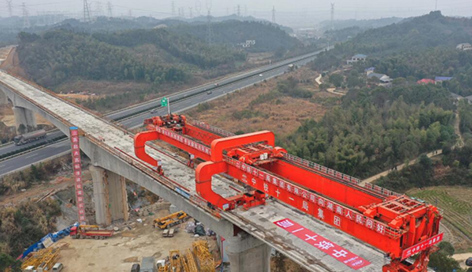 1月31日,由中铁十一局承建的常(德)益(阳)长(沙)高铁岳临高速特大桥顺利完成箱梁架设,至此,中铁十一局常益长高铁项目圆满完成标段内全部箱梁架设任务,全面转入线上施工。图为常益长高铁六标箱梁架设现场。(记者 赵众志 摄)