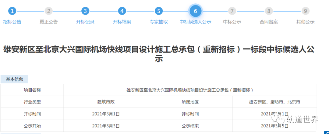 3月2日,雄安新区至北京大兴国际机场快线项目设计施工总承包(重新招标)一至五标段中标候选人结果出炉,以下为详情: