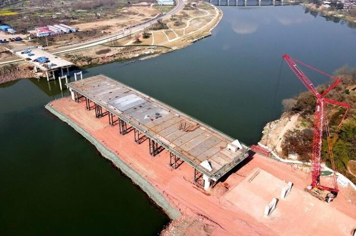 大桥的主跨钢箱梁目前已完成80%的安装工程量,整个淮州湾大桥预计明年可实现全线贯通。据悉,这是淮州新城首座大跨度钢拱箱梁结构桥,桥身采用预制拼装施工,由350吨级的大型履带起重机将梁段吊装到主梁之上进行拼装。