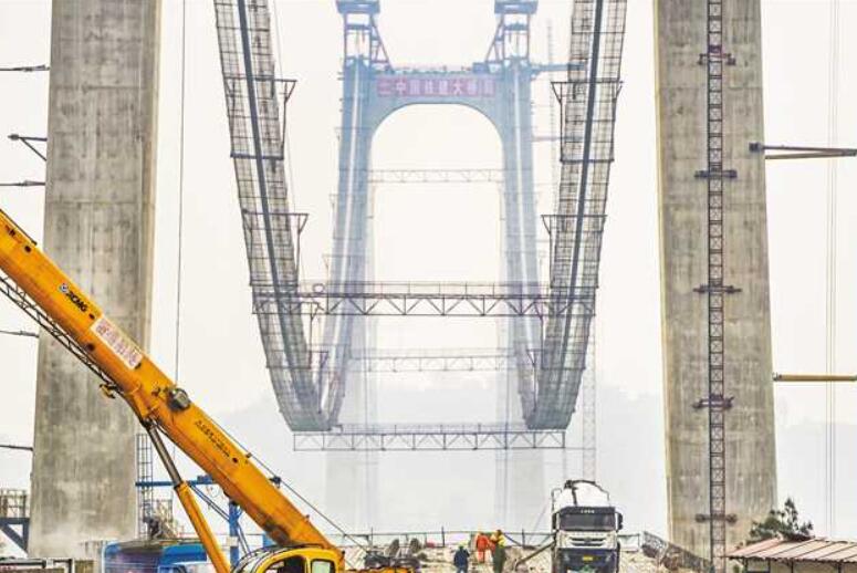 3月30日,合璧津高速公路油溪长江大桥施工现场,工人正在加紧施工。目前,大桥进入悬索施工阶段。油溪长江大桥作为合璧津高速公路重要节点,跨越长江至龙华镇、慈云镇,终点接江习高速。