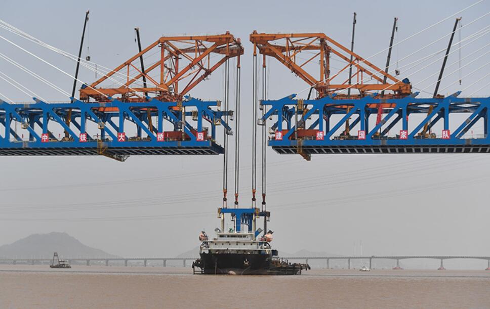 4月17日,施工人员在进行杭绍台铁路椒江特大桥最后一片钢梁的吊装施工。