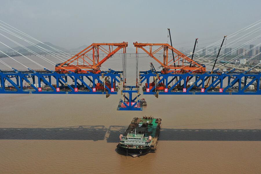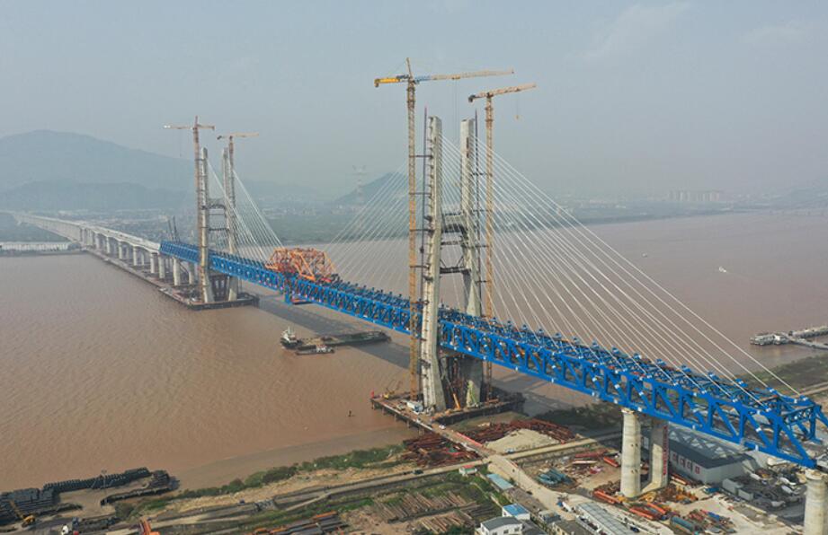 当日,在浙江台州的杭绍台铁路建设施工现场,随着最后一片钢梁吊装完成,杭绍台铁路控制性工程椒江特大桥顺利合龙。