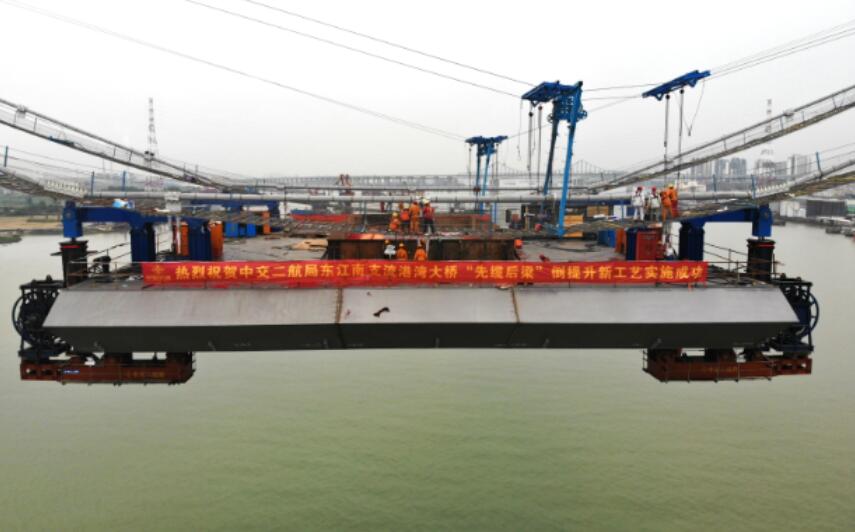 日前,东江南支流港湾大桥项目首榀使用“先缆后梁”倒提升工艺的钢箱梁架设完成。此次“先缆后梁”自锚式倒提升工艺是中交二航局桥梁施工首创,为公司在类似桥梁设计提供了新理念、新思路,给后续桥梁施工提供了宝贵经验。