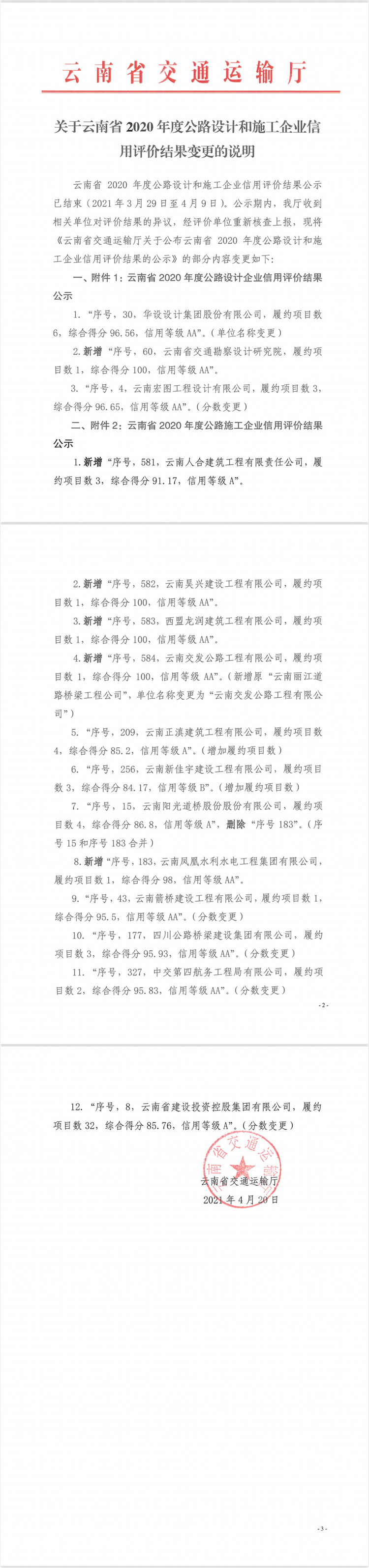 云南省2020年度公路设计和施工企业信用评价结果变更的说明